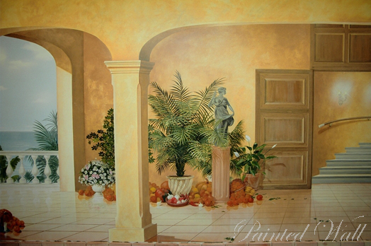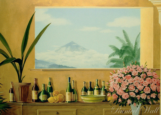 Für die Neugestaltung des Restaurants im Grand-Hotel Atalaya auf Tenerifa beauftragte man uns, den Raum durch Wandmalerei optisch zu erweitern und einen Blick auf den Teide zu ermöglichen. Durch die Zentralperspektive und eine sehr genaue Konstruktion der in die Tiefe gehenden Architektur, gelang uns eine optimale Täuschung.