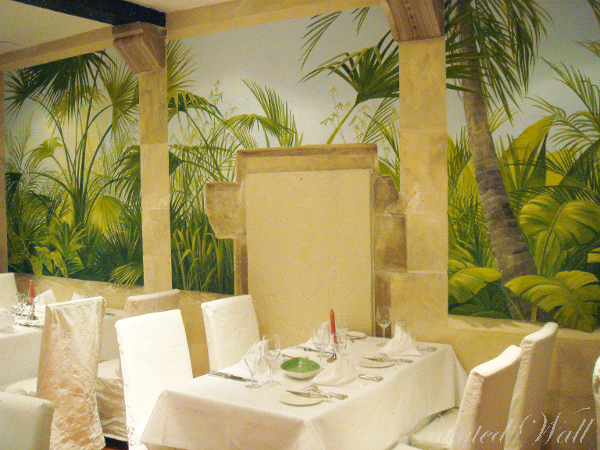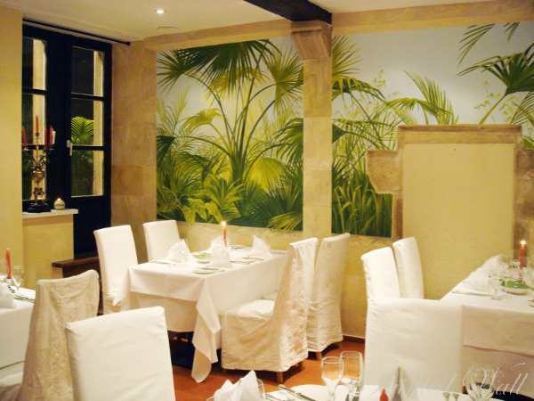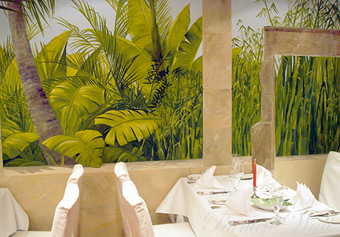 Ein 200 Jahre altes Haus in neuem Gewand! Die kleinen, dunklen Räume erblühen durch gemalte tropische Pflanzen zu einem Paradies. Die wichtigsten Elemente der Architektur werden malerisch erweitert, um die Räume in die Tiefe zu öffnen.