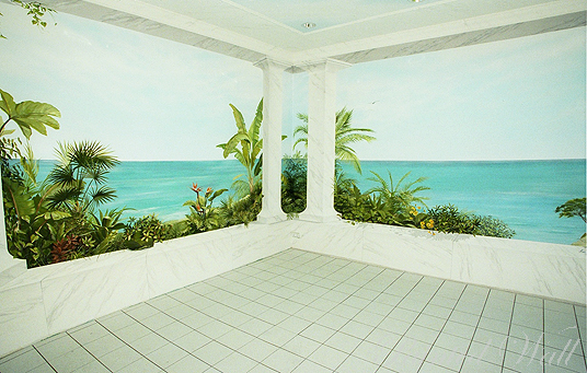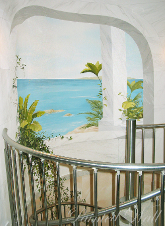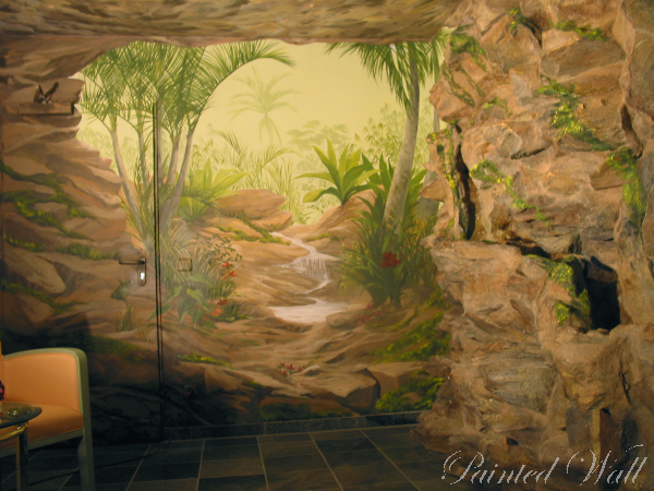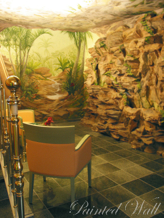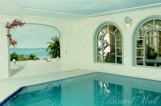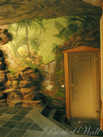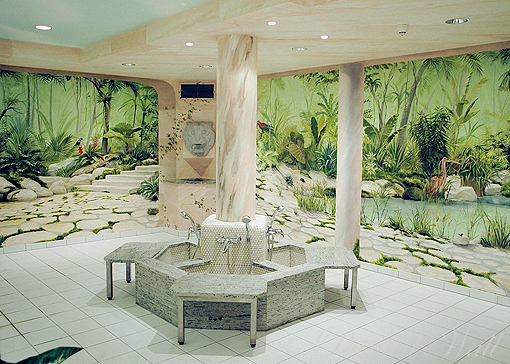 Das Luxushotel „Villa Heine“ in Halberstadt hielt verschiedene Aufgaben für uns bereit. Das große Hotelschwimmbad sollte mit Trompe l'œil Malerei versehen werden, und zwar auch die danebenliegenden Entspannungsbereiche. Im Untergeschoss erschufen wir in der Saunalandschaft des Hotels malerisch den Garten Eden- eine feuchtwarme Dschungellandschaft mit exotischen Tieren und Pflanzen.
