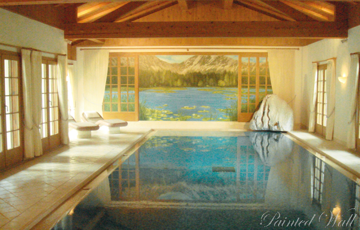 In diesem Schwimmbad wurde ein in der Nähe gelegener Bergsee nachempfunden und farblich dem Wasser des Pools angepasst.