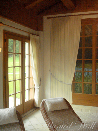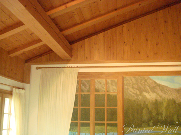 Ein schöner, illusionistischer Effekt sind das gemalte Holz im Giebel, sowie die gemalten Gardinen entsprechend den wirklich vorhandenen.