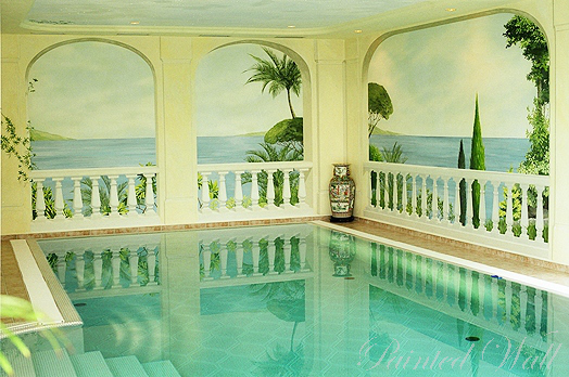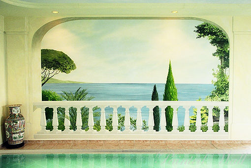 Pinien und Zypressen bilden den Fordergrund in diesem Bad. Eine in den weißen, gemalten Marmor einbezogene Skulptur erinnert an Italien.