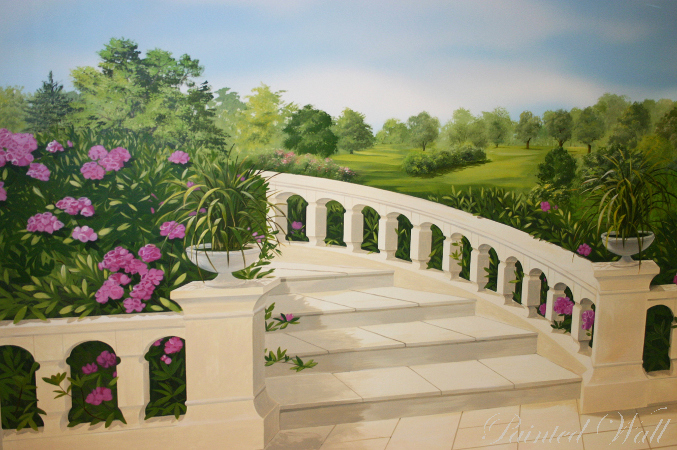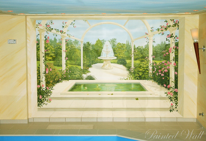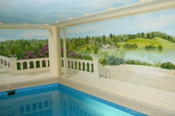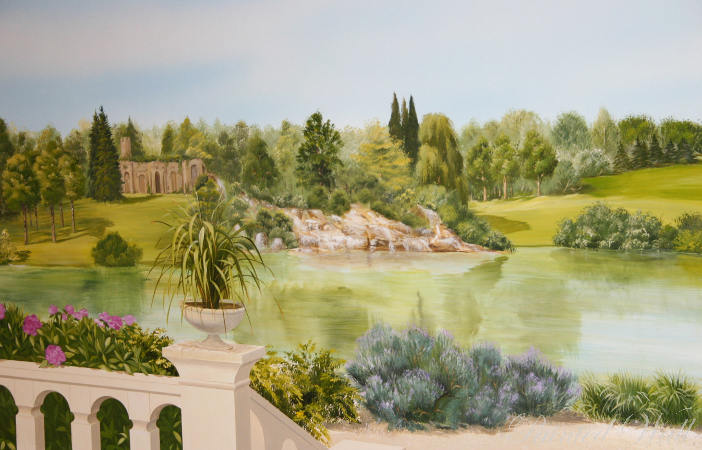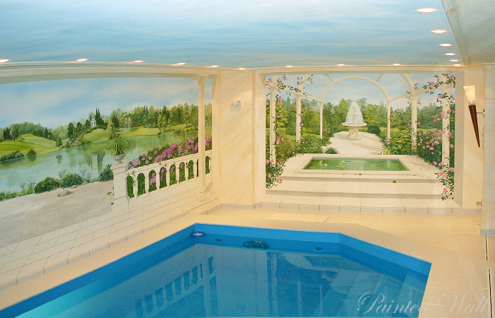 Dieses eher kleine Schwimmbad fasziniert durch die Wirkung der Wandmalerei als Möglichkeit der Raumerweiterung. Die Bauherren wünschten sich eine europäische Parklandschaft mit Architektur, Brunnen, kleiner Kirchenruine und Pavillon in der Ferne. Der Schwung der großen Treppe an der Stirnseite des Bades begleitet den Betrachter in die Tiefe des Parks und leitet über in die Seenlandschaft. Große Rhododendronblüten stehen prächtig vor den vielfältigen Grüntönen der Landschaft.