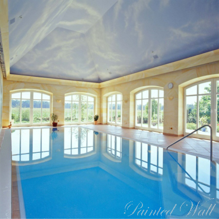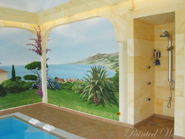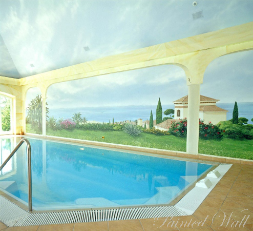Den Auftraggebern dieser Schwimmbadmalerei fehlte leider die Zeit, ihr schönes Anwesen in Marbella häufig zu besuchen. Anhand von Fotografien malten wir den Blick aus ihrer Ferienvilla in Richtung Süden mit dem Felsen von Gibraltar. Auch hier beeindruckt das Zusammenspiel von Illusionsmalerei, Marmormalerei und Himmelsgestaltung in Airbrushtechnik.