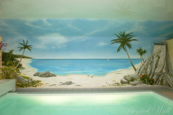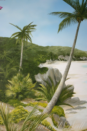 Das Thema dieses Schwimmbadmalerei sind die Seychellen. Die Form der Bucht führt den Blick des Betrachters weit aufs Meer hinaus.