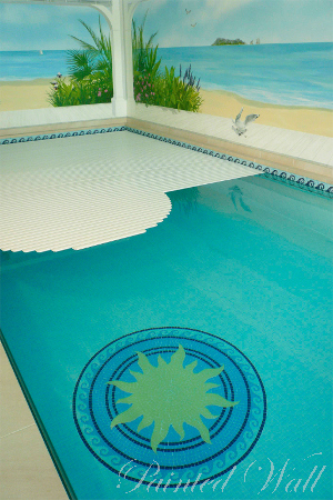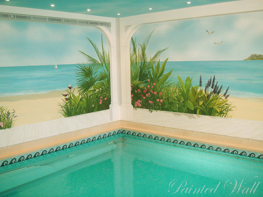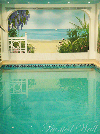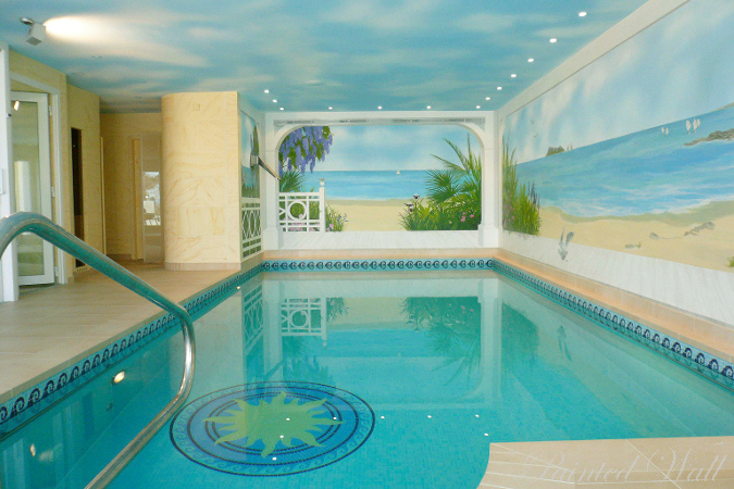 Die Costa Brava mit ihren vorgelagerten Inseln und ihren Buchten lag diesen Bauherren besonders am Herzen. In diesem Schwimmbad planten wir neben der Wandmalerei das Licht, die Akustik – und Videoanlage sowie die Bar.