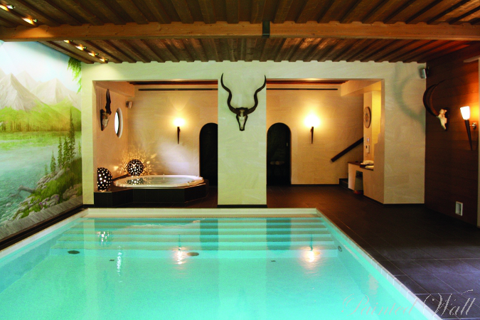 Diese Fotos zeigen eine Schwimmhalle nach der Sanierung. Sie befindet sich in einem Jagdhaus in Bayern und wurde zu einer kleinen Wellnessoase umgebaut. Nun gibt es hier außer dem großen Pool einen Whirlpool, eine Regenwalddusche, eine Dampfsaune und eine Finnische Sauna.