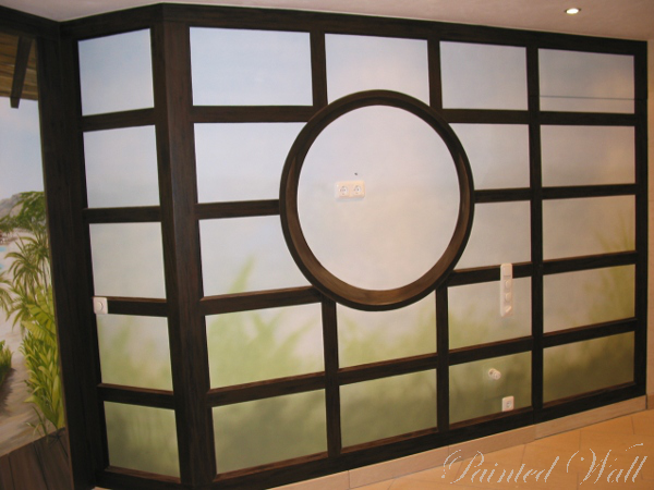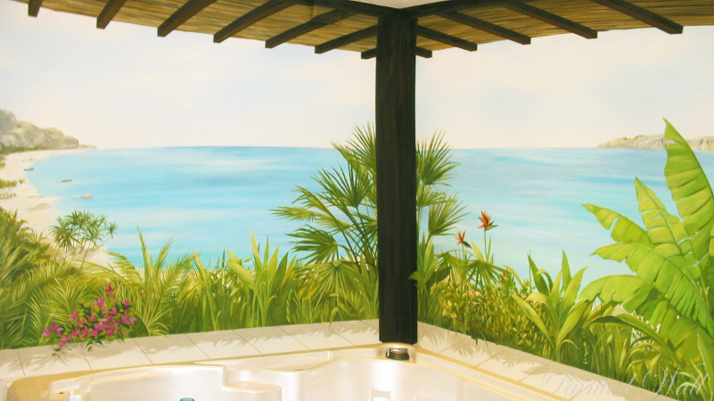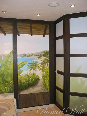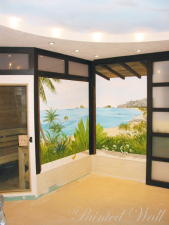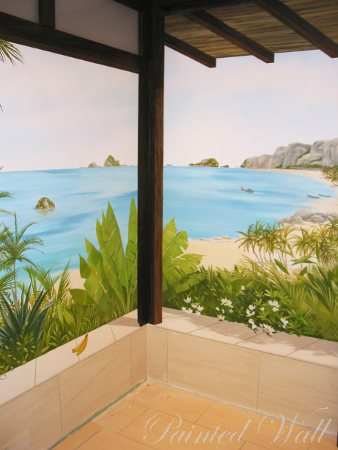 Ein unvergleichlicher Urlaub auf Kho-Pi-Pi Island inspirierte die Auftraggeber zu einer solchen Illusionsmalerei in ihrem Wellnessbereich. Eine besondere Attraktion der Wandmalerei stellt die gemalte, gläserne Wand dar. Sie lässt eine weite Naturlandschaft dahinter erahnen. Auch die Holzkonstruktion ist gemalt.