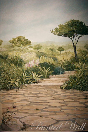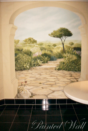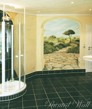 Die Wandmalerei in diesem Baderaum führt den Betrachter in einen mediterranen Garten.