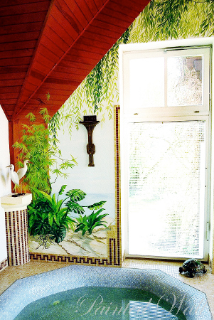 Die weiten Ebenen und der Dschungel Afrikas sind das Thema dieser Wandmalerei. Die Illusionsmalerei nimmt bewusst die Holzarchitektur in sich auf und erweitert so den Raum in die Natur hinaus.