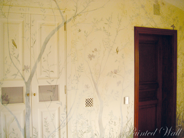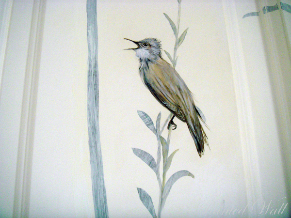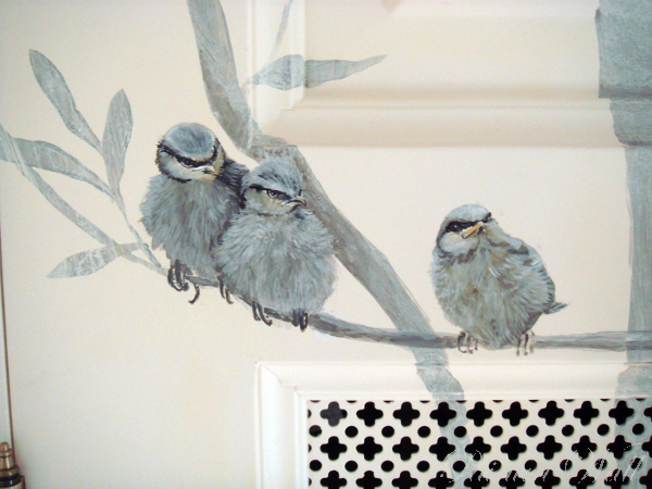 Ein Schrank in einem 8m hohen Treppenhaus wurde mit Pflanzen und mit singenden Vögeln bemalt. Vor diesem Schrank wir später ein weißer Flügel stehen. So wird es eine sehr musikalische Situation.