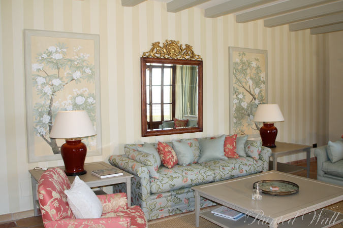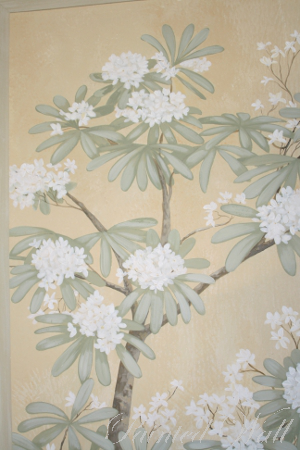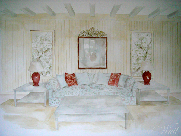 Wir kamen auf die Idee, die "Streifen" der Decke an der Wand zu wiederholen. Auf diesen malten wir dazu passend zwei Blütenbilder.